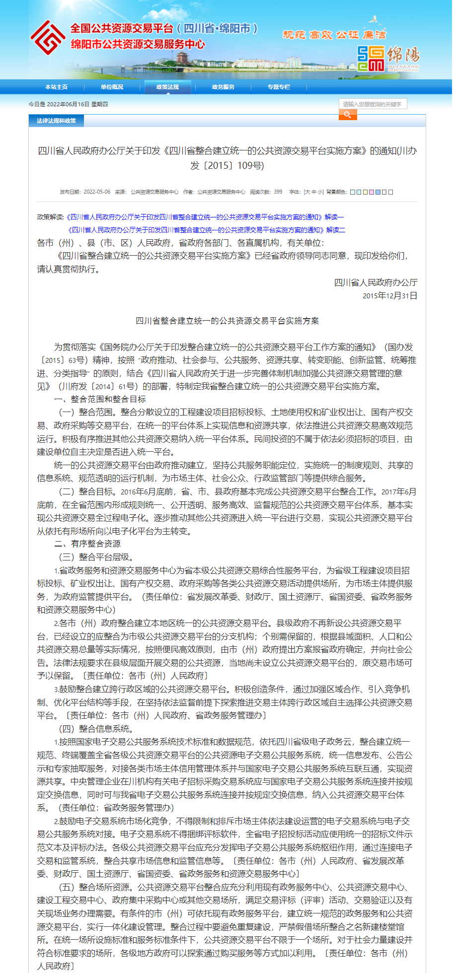 四川省人民政府辦公廳關(guān)于印發(fā)《四川省整合建立統(tǒng)一的公共資源交易平臺(tái)實(shí)施方案》的通知(川辦發(fā)〔2015〕109號(hào))